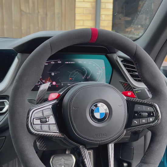 Inspired by the latest LCI design from BMW’s G Series models, this alcantara steering wheel adds aggressive styling and improved grip to your cockpit. The red centre stripe, carbon fibre accents, and thick M-style grip all reflect a sport-driven design while retaining full OEM functionality.