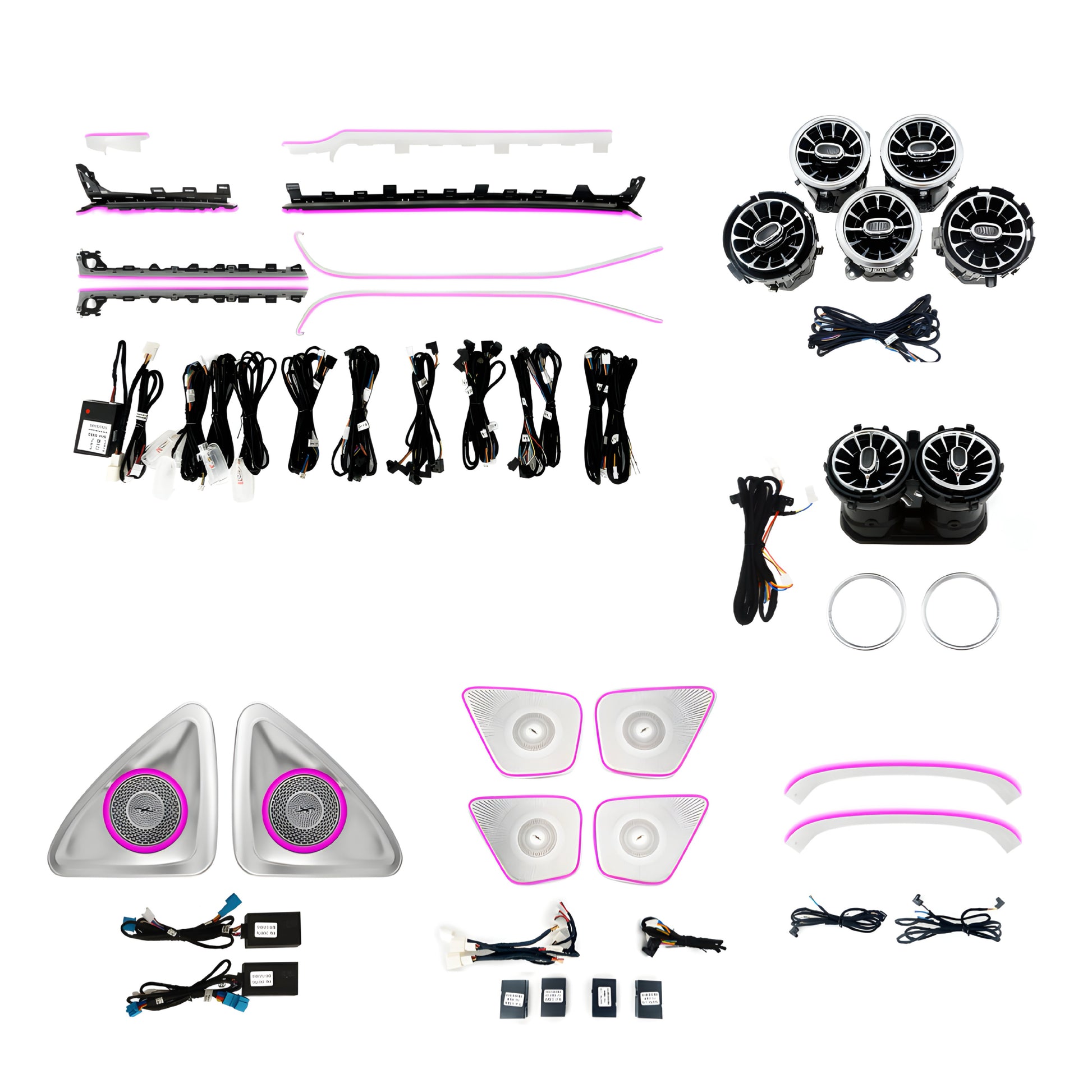 This package uses original Mercedes-Benz ambient lighting components, not aftermarket strips or third-party lighting. Every part is built to the same standard as the factory-installed system, ensuring perfect colour consistency, brightness, and integration throughout the cabin.