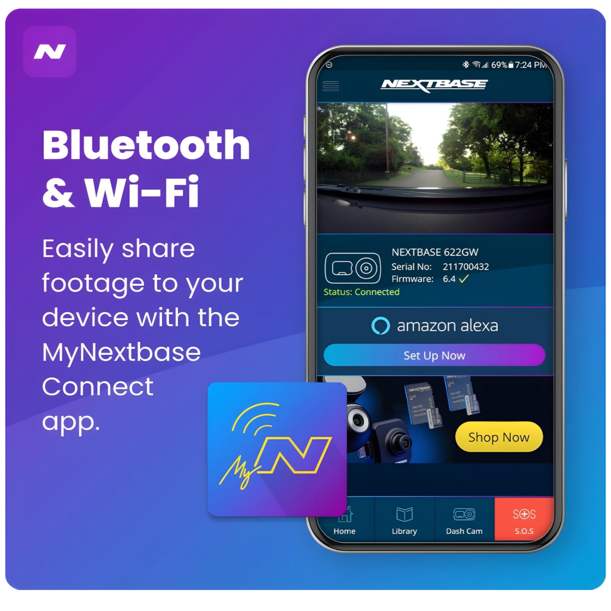 Equipped with a 2.5" HD IPS touchscreen, this dashcam is easy to set up and control, while built-in Wi-Fi and Bluetooth make it simple to share and back up your clips directly to your smartphone via the Nextbase app.