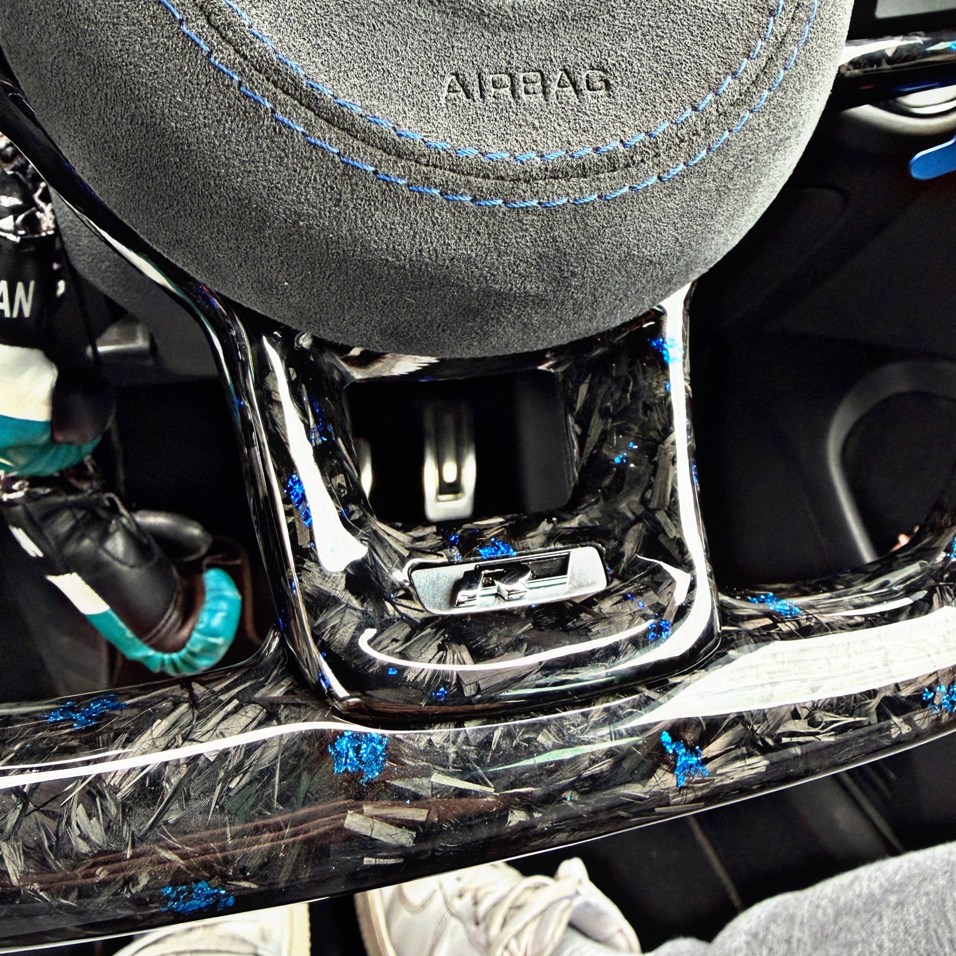 Each steering wheel is hand-finished using real forged carbon fibre across the top and bottom sections, paired with soft, high-grip Alcantara side grips for a perfect balance of luxury and performance.
